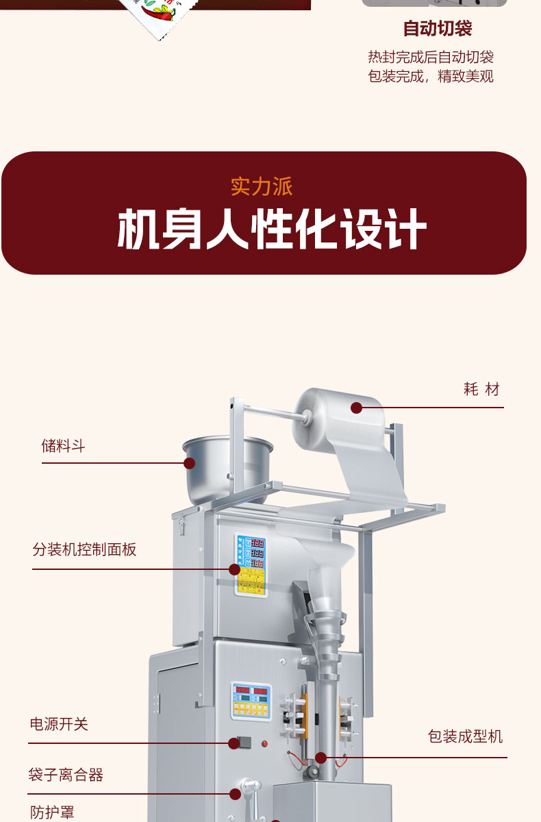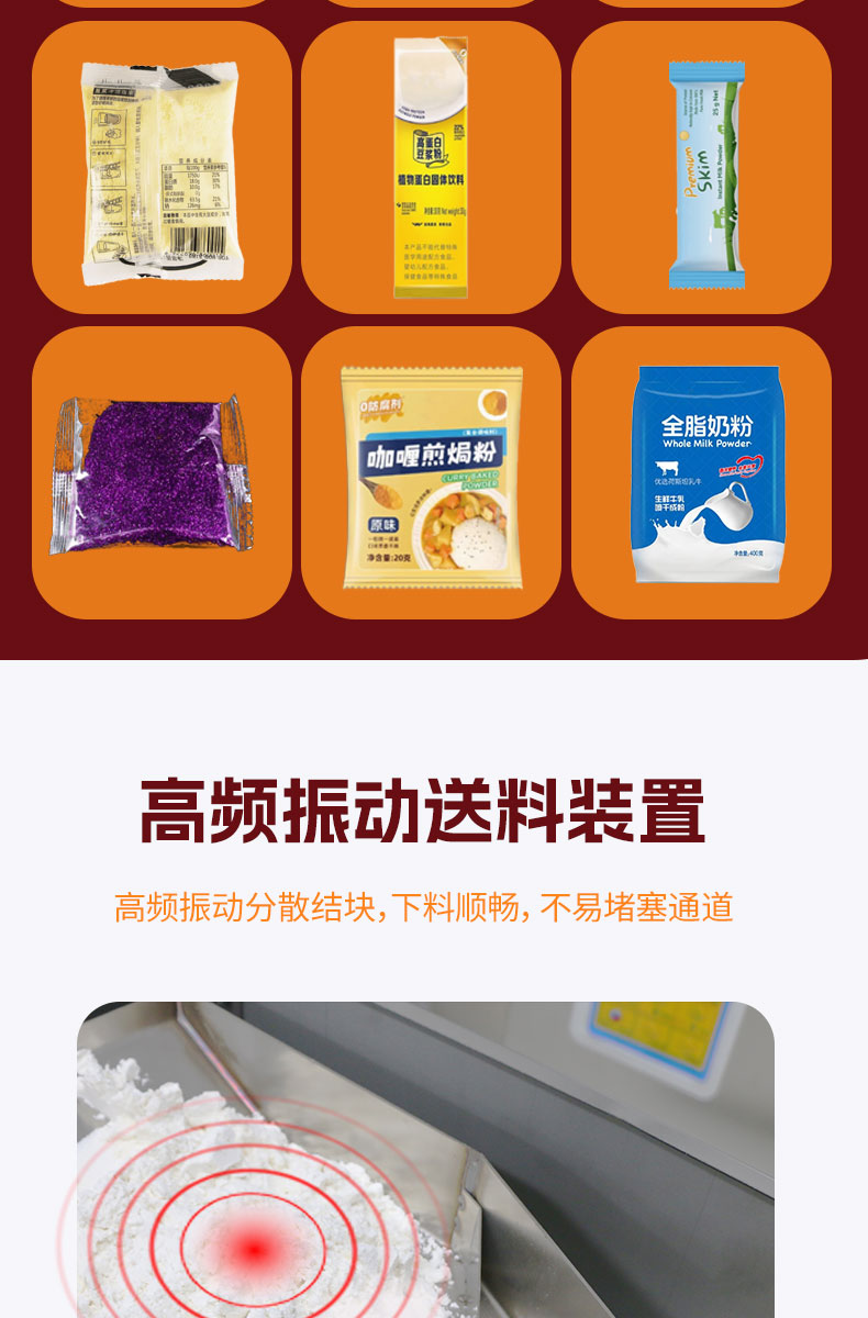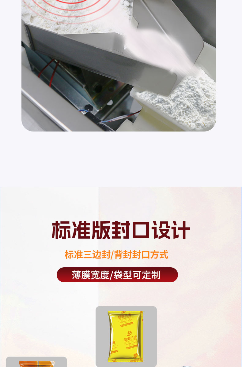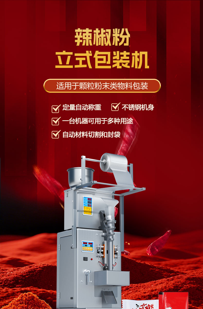 捷鼎生產(chǎn)的1-100g電動小型包裝機適用于辣椒粉、抹茶粉、咖喱粉、奶粉、咖啡粉、面粉、胡椒粉、調(diào)味粉等粉末、物料等的定量、稱重、灌裝,封口